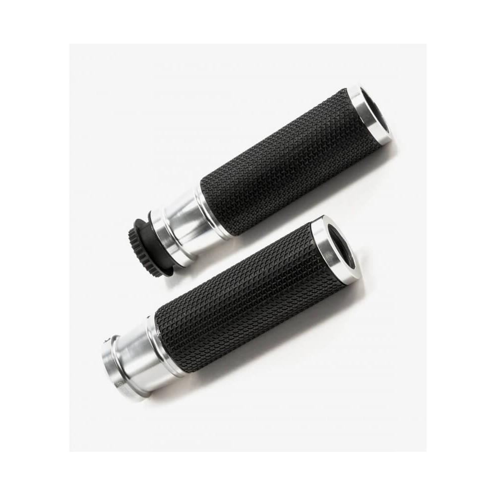 Poignées moto argent Puig Ascent Grips pour guidon 22 mm, en caoutchouc avec inserts aluminium colorés. Longueur 119 mm.