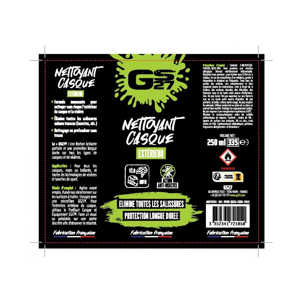 Grâce à sa formule moussante, le Nettoyant Casque - Extérieur GS27® nettoie en toute sécurité l’extérieur du casque et la visière.