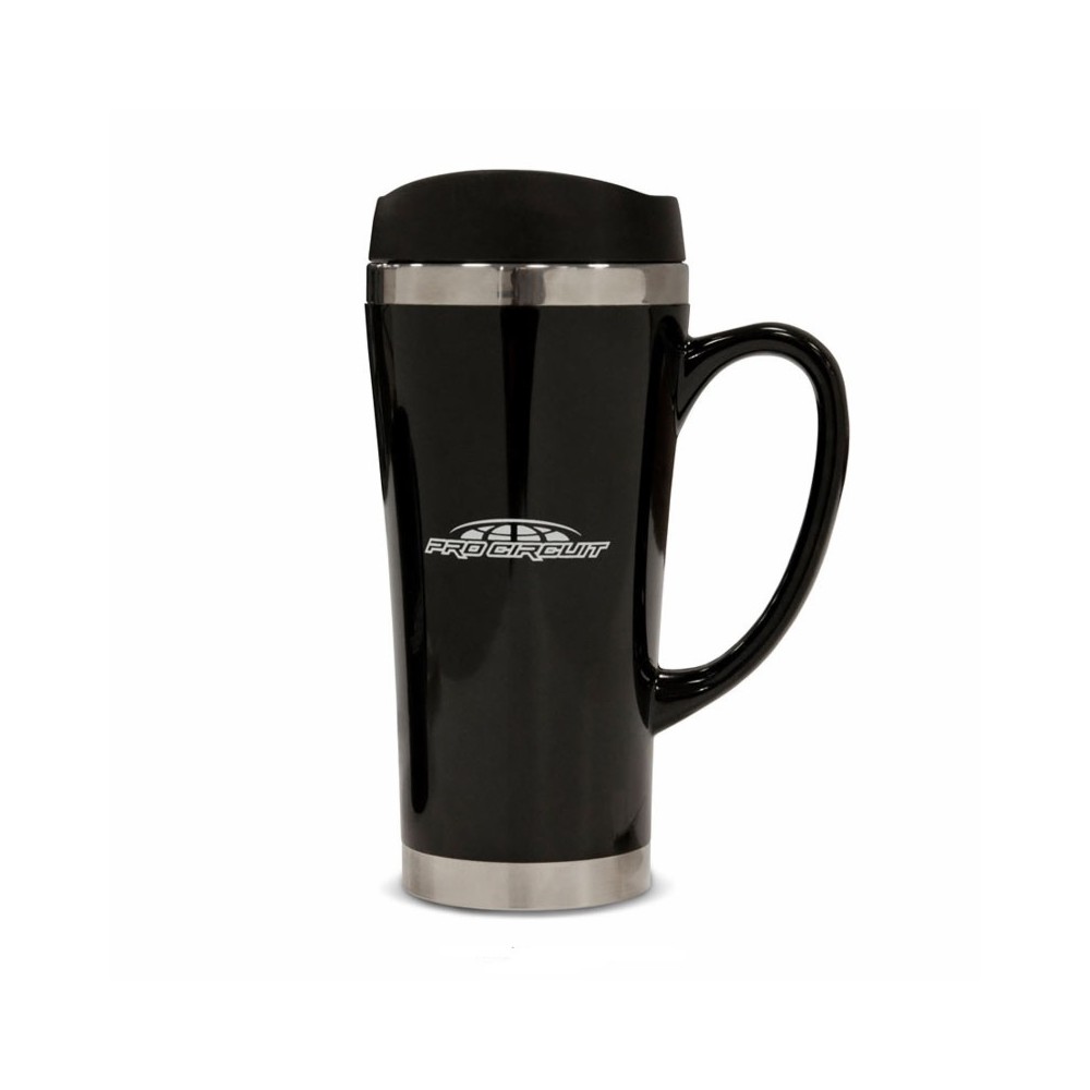 Ce mug noir de 47 cl (16 oz) est doté d'un extérieur en acrylique et en acier inoxydable, d'une doublure en acier inoxydable et d'un aspect céramique. Il comprend également un couvercle coulissant résistant aux fuites et les logos emblématiques de Pro Circuit.