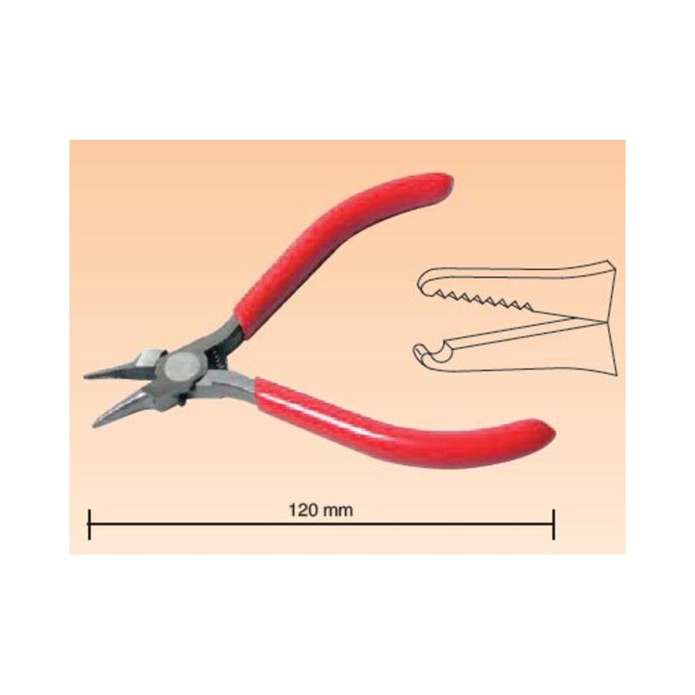 Pince à becs extra-fins et dentelés pour retirer le clip d'axe de piston facilement et sans risque d'endommagement.