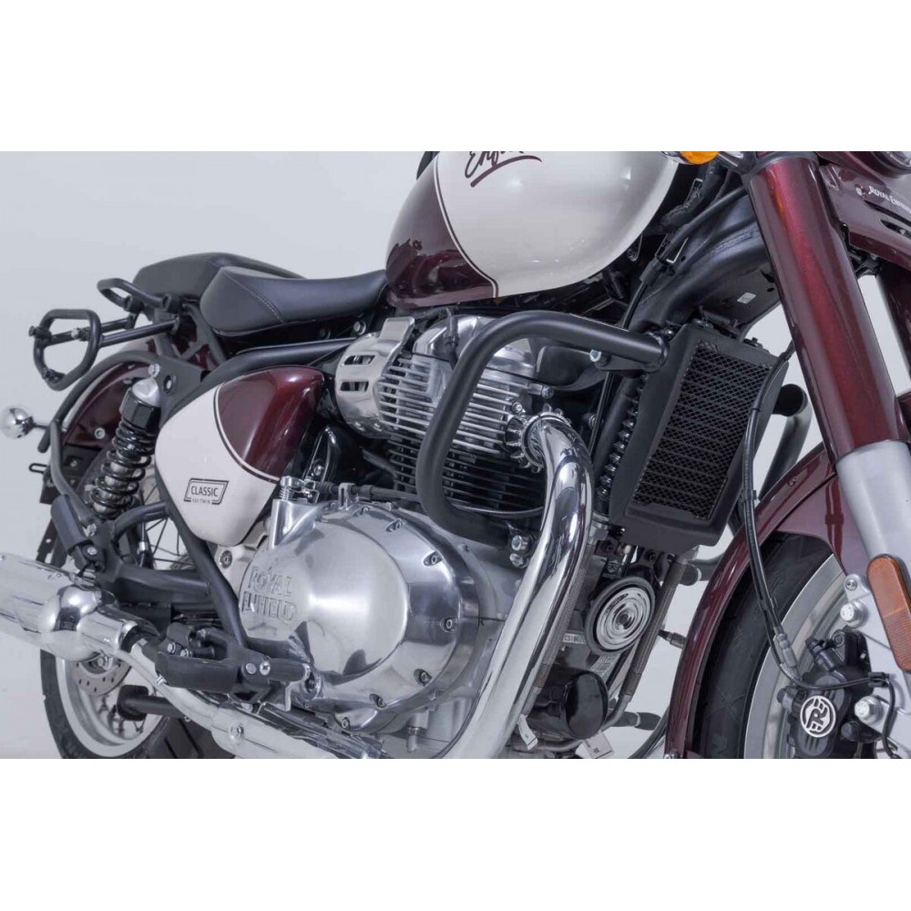 Ce robuste arceau en acier inoxydable spécialement conçu pour la Royal Enfield Classic 650, protège votre moteur et ses composants des rayures et des dégâts dus aux chutes. L'emploi d'acier inoxydable sablé et électropoli, au lieu d'acier galvanisé, offre l'avantage qu'il n'y a pas de risque de diminuer la protection contre la corrosion après un éclat de peinture.