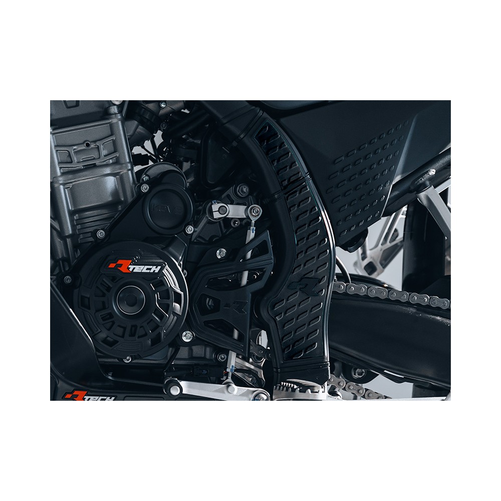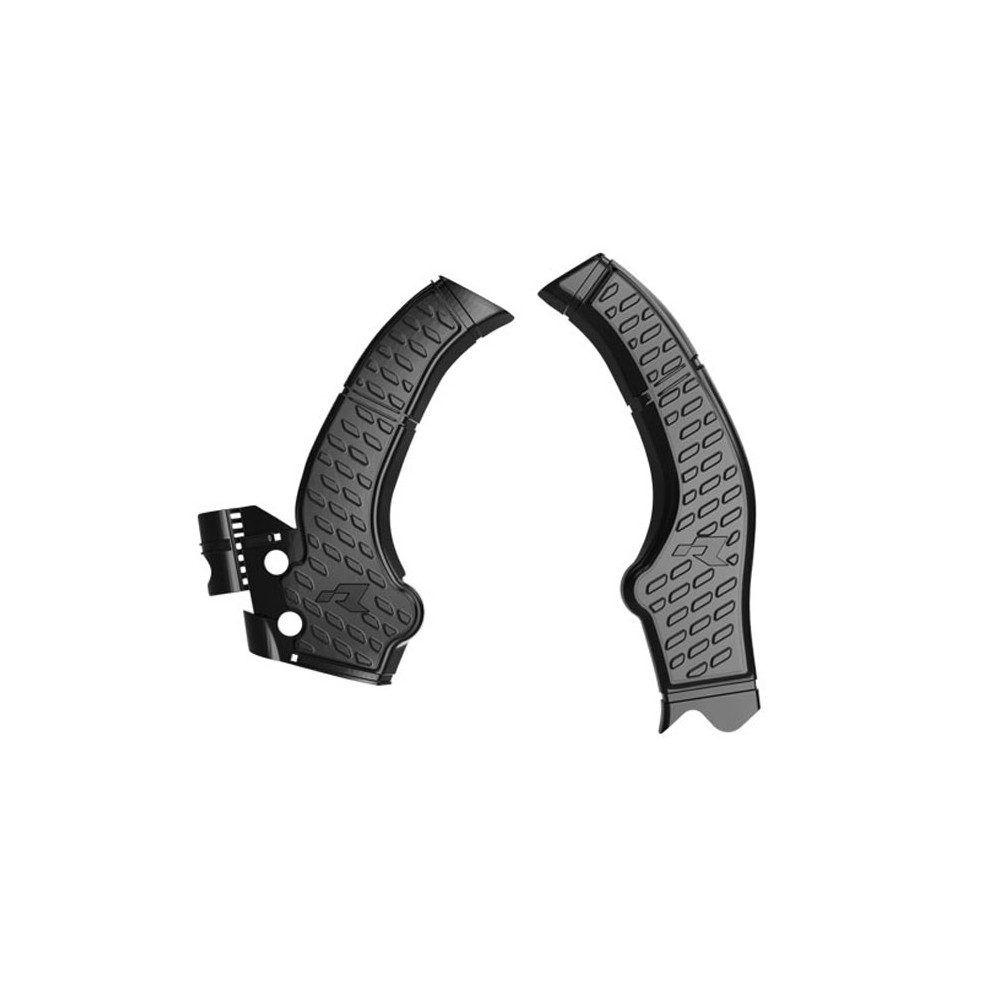Protections de cadre composées d’un corps externe en technopolymère et d’une partie interne en caoutchouc, conçues pour maximiser l’adhérence entre la protection et la botte. Protection graphique intégrée et facilement amovible. Kit de fixation avec colliers de serrage inclus.