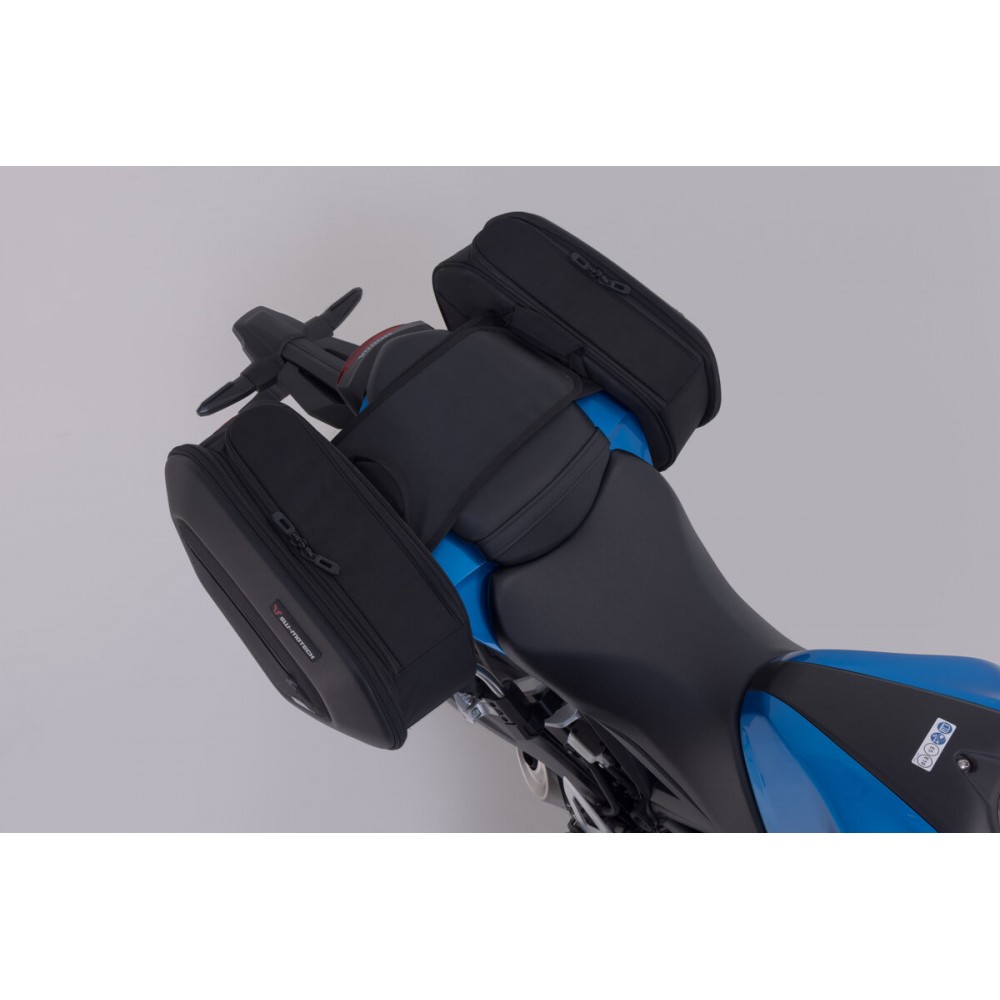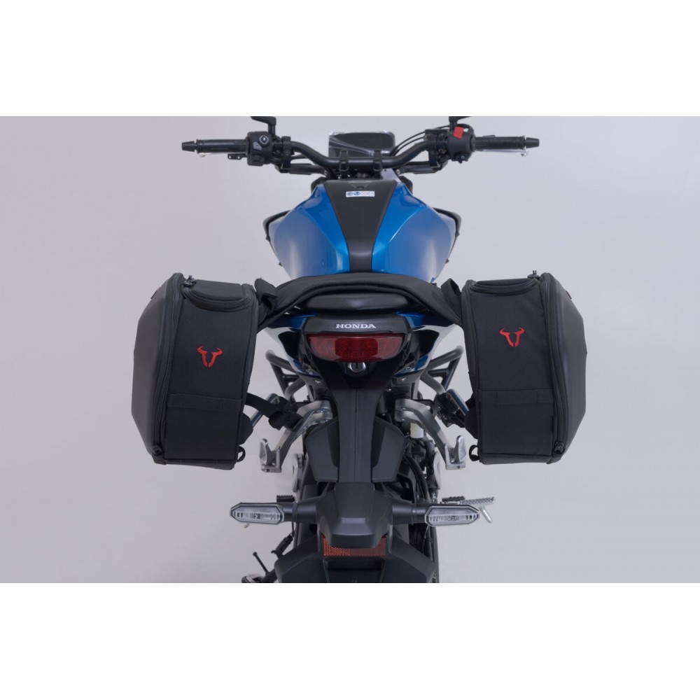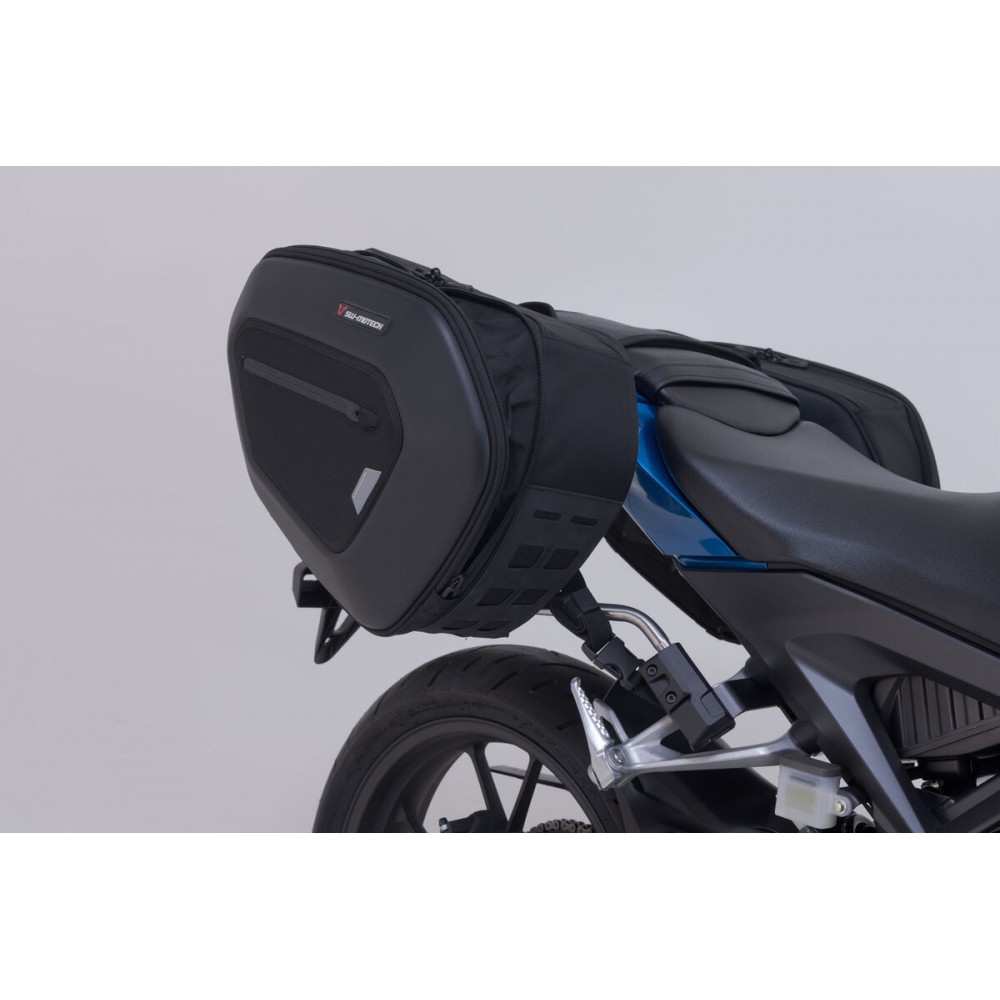La version haute des sacoches latérales PRO BLAZE a été spécialement développée pour les motos à échappement en position haute. En raison de leur position élevée, les sacoches ne sont pas affectées par le rayonnement thermique des gaz d'échappement. SW-MOTECH produit ce set de sacoches avec des supports latéraux adaptés à les Honda CB125R.