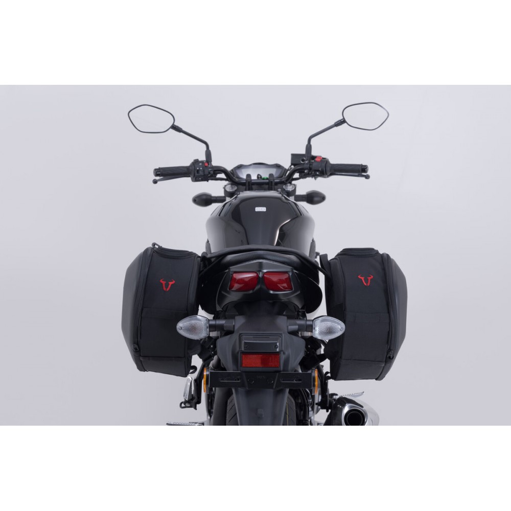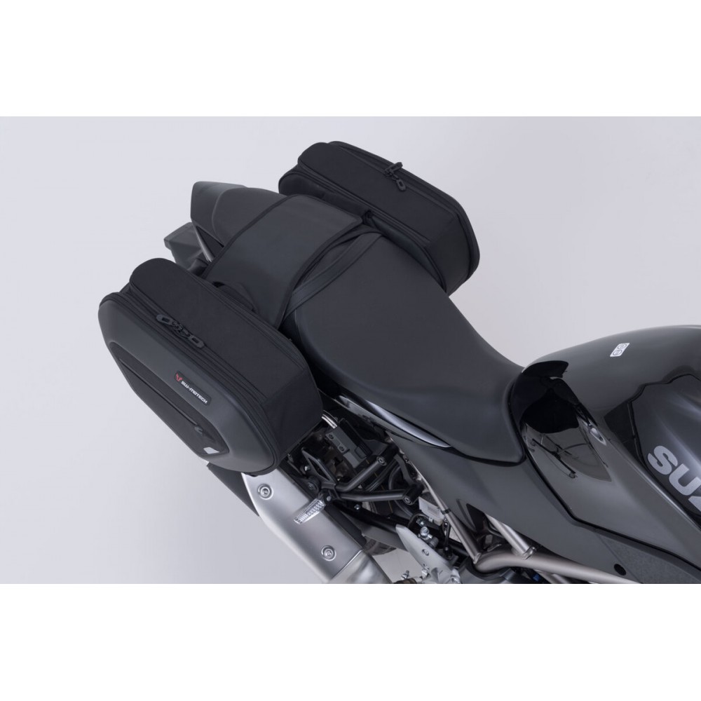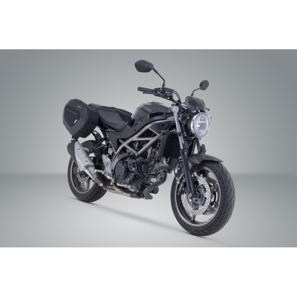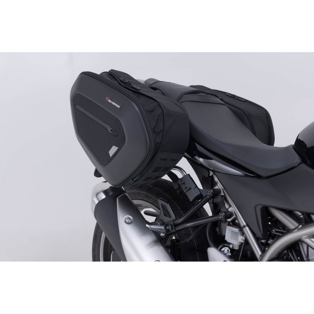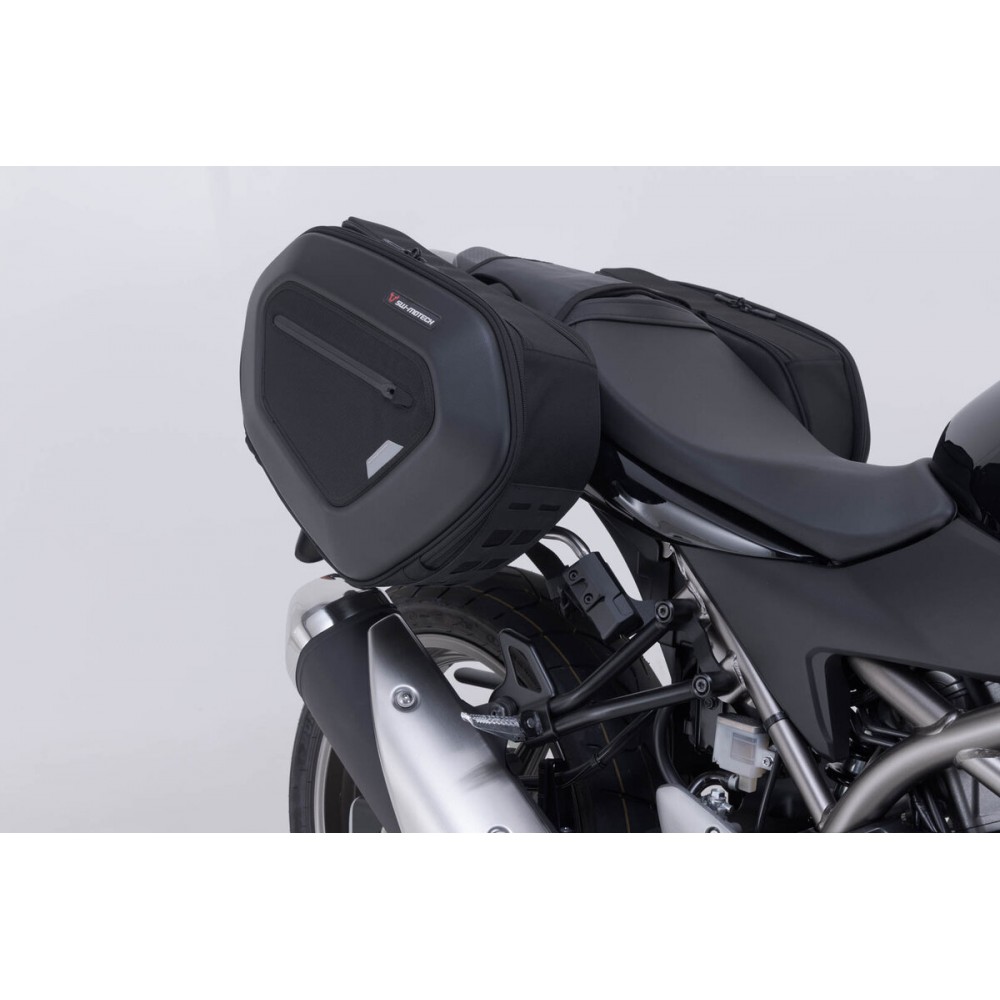 La version haute des sacoches latérales PRO BLAZE a été spécialement développée pour les motos à échappement en position haute. En raison de leur position élevée, les sacoches ne sont pas affectées par le rayonnement thermique des gaz d'échappement. SW-MOTECH produit ce set de sacoches avec des supports latéraux adaptés à les Suzuki SV650.