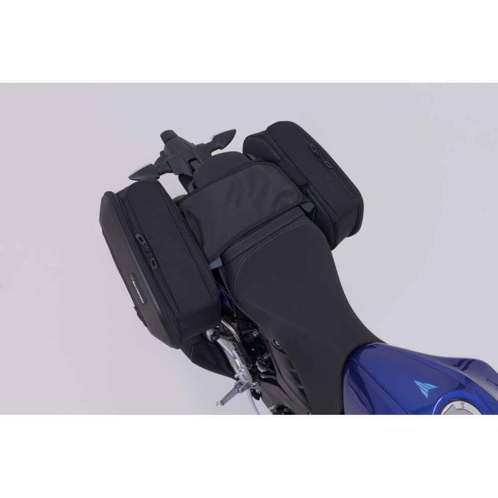 La version haute des sacoches latérales PRO BLAZE a été spécialement développée pour les motos à échappement en position haute. En raison de leur position élevée, les sacoches ne sont pas affectées par le rayonnement thermique des gaz d'échappement. SW-MOTECH produit ce set de sacoches avec des supports latéraux adaptés à les Yamaha MT125.