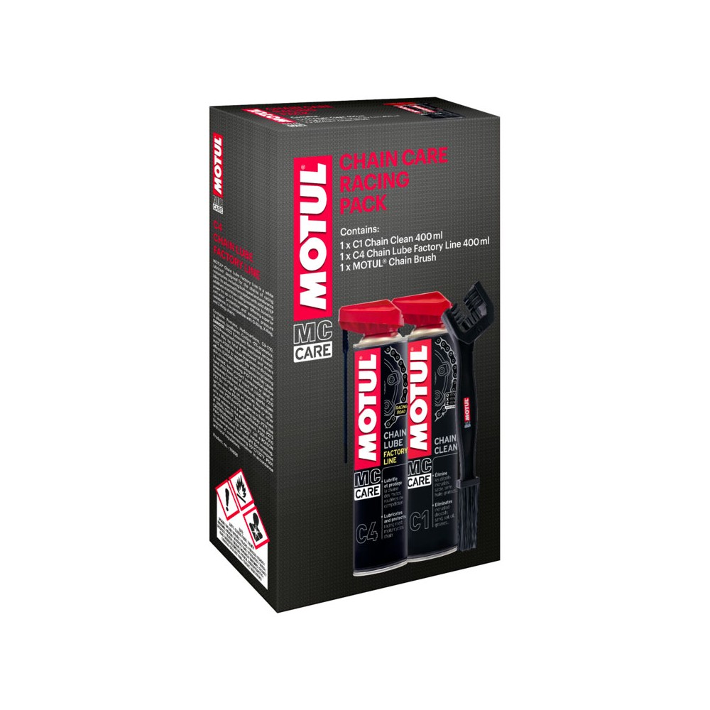Motul vous propose un kit d'entretien chaine route, avec un emballage soigné qui peut être une idée de cadeau.