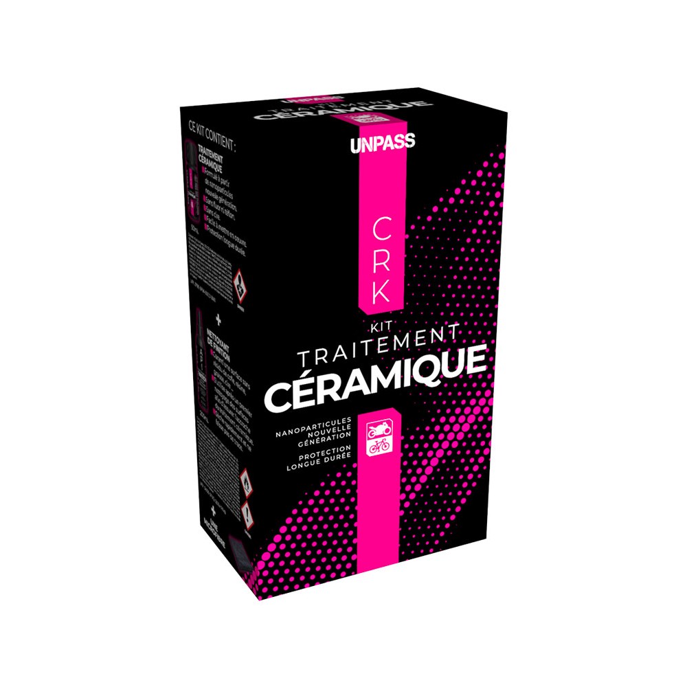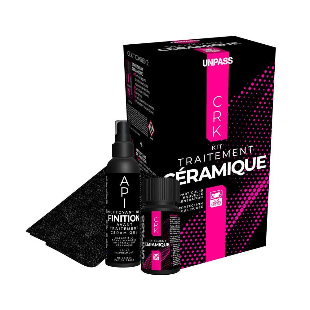 Le KIT CRK vous apporte l’ensemble de produits nécessaires pour réaliser un traitement céramique de protection des surfaces des 2 roues : un traitement céramique (CRK) en 50mL, un nettoyant de finition (API) en 200mL, 1 microfibre de finition (noire).